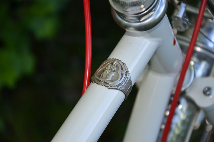 A little more on the medallion on the top tube of my build. Madonna di Ghisallo is the patron saint of cyclists. The medallion can be bought from the chapel at the top of Ghisallo Pass north of Milan but I bought a few from a table a the bike jumble the Saturday before I rode L’Eroica 2012 . Unfortunately, we don’t have any for sale but apparently Ric Hjertberg, the “Wheel Fanatyk”, has some available http://wheelfanatyk.blogspot.ca/ .