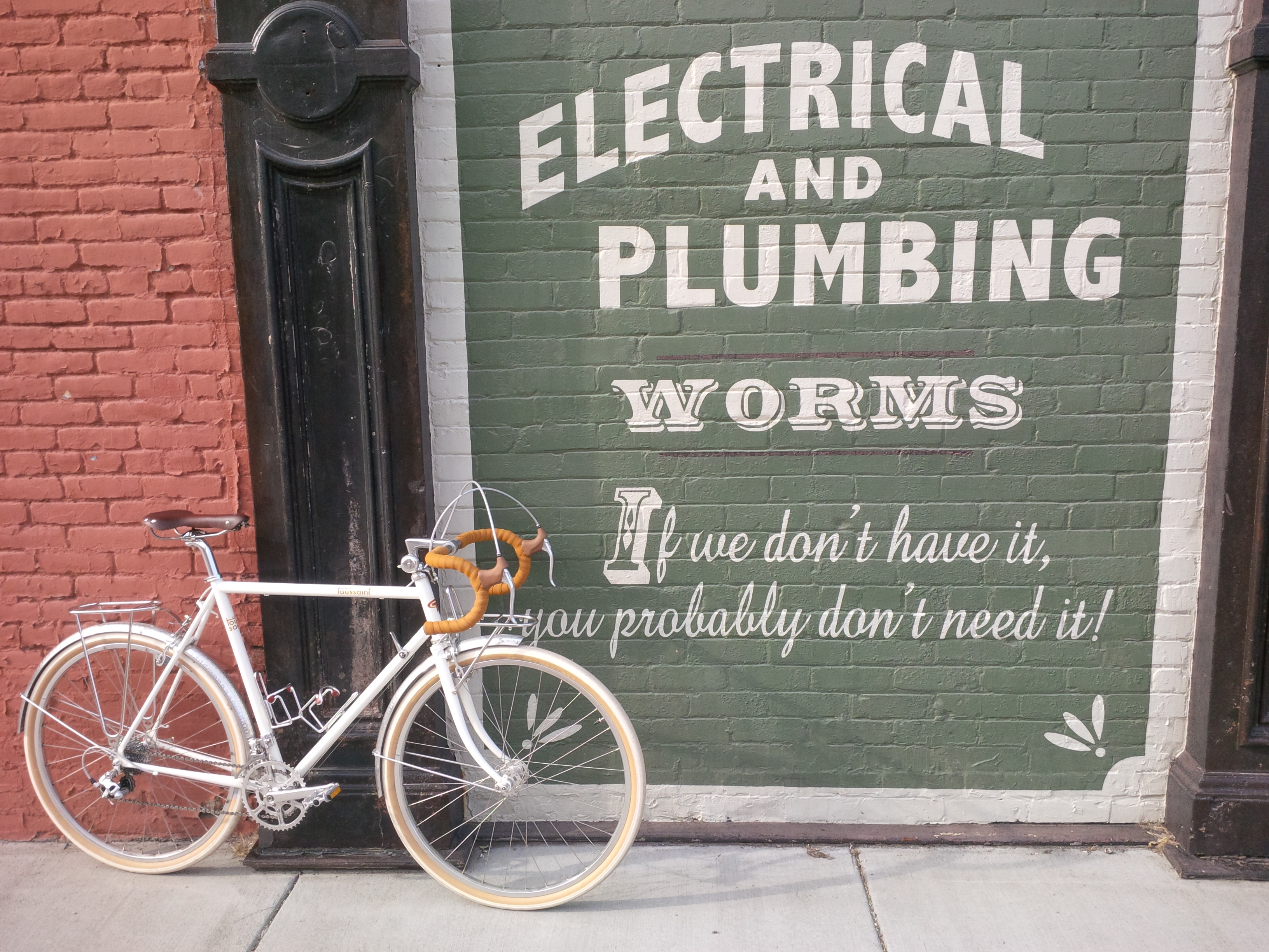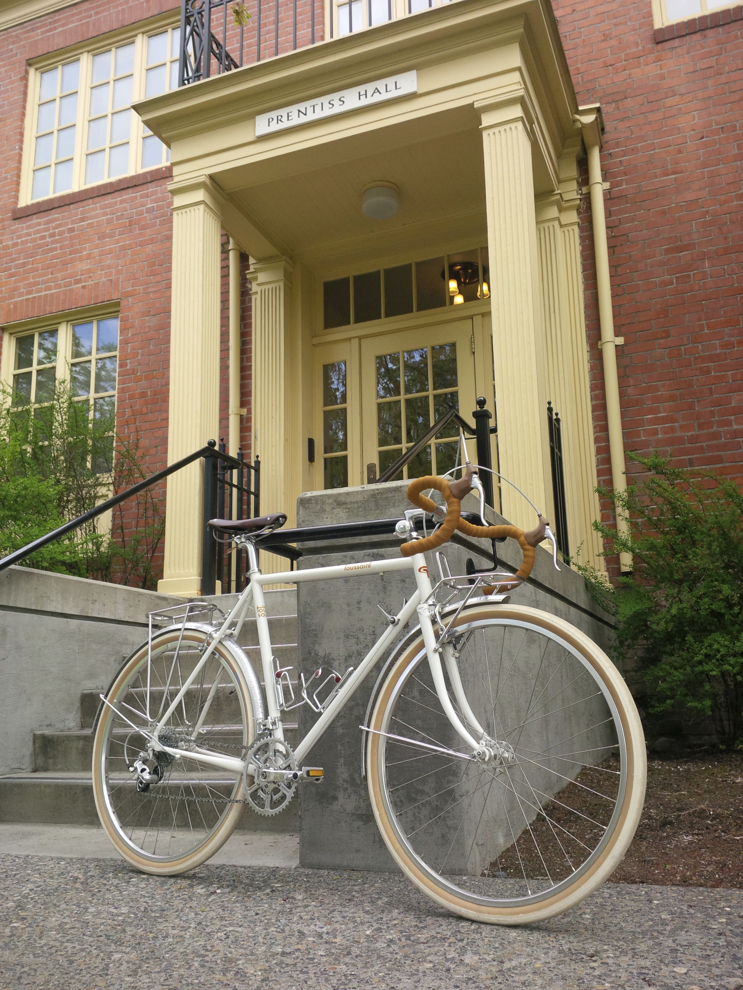 Alas I am getting a head of myself. Let me tell you how this all came about. A few weeks ago I was in Port Townsend, WA with my wife. Naturally I stopped into PT CYCLERY to chat with Bob the owner. I had bought a road bike from him because my commute/mountain bike just could not give me the need for speed that I was desiring. Well, along the wall stood this bike. At first it reminded me of bikes I had seen built in some ones garage with whatever they could find and use for parts. I myself had taken my Stingray, to us we called them Cheater Slick bikes and extended the forks to give it more of a chopper look. Needless to say we had some interesting accidents. Then I realized this was nothing like those bikes. It was funky yet in a very cool way. I loved the plates on the seat stay and forks. That and the fact it was stainless steel caught my attention. Bob let me take it for a quick spin. Those few minutes was all it took for me to realize there was more to this bike beyond just the cool look and white tires.